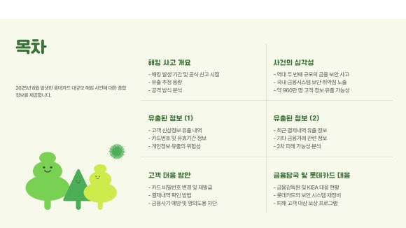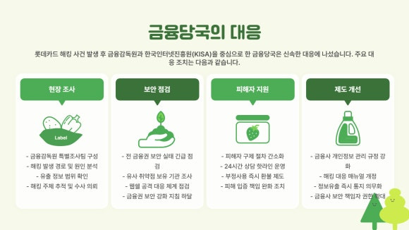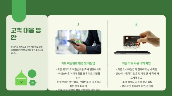 - 롯데카드는 보안 시스템 전면 재정비와 함께, 피해 고객 대상 부정결제 모니터링 및 보상 프로그램 운영 예정