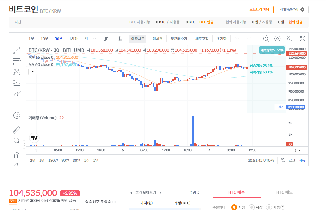 - 오류 지점: 원화(KRW) 지급 단위를 비트코인(BTC)으로 잘못 선택한 것으로 보입니다.