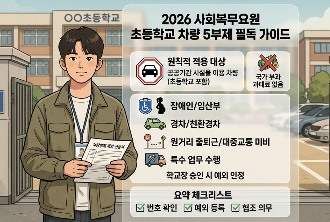 안녕하세요. 오늘은 초등학교나 교육청 등 공공기관에서 근무하는 분들이 가장 궁금해하시는 사회복무요원 차량 5부제 적용 여부에 대해 상세히 알아보겠습니다. 2026년 현재 고농도 미세먼지 대응과 에너지 절약을 위해 많은 기관에서 사회복무요원 차량 5부제를 시행하고 있는데요. 특히 초등학교 근무자라면 본인이 사회복무요원 차량 5부제 대상인지 헷갈리는 경우가 많습니다. 결론부터 말씀드리면, 사회복무요원 차량 5부제는 신분이 아닌 '출입 차량'을 기준으로 하므로 주의가 필요합니다. 지금부터 사회복무요원 차량 5부제 핵심 정보를 정리해 드립니다.