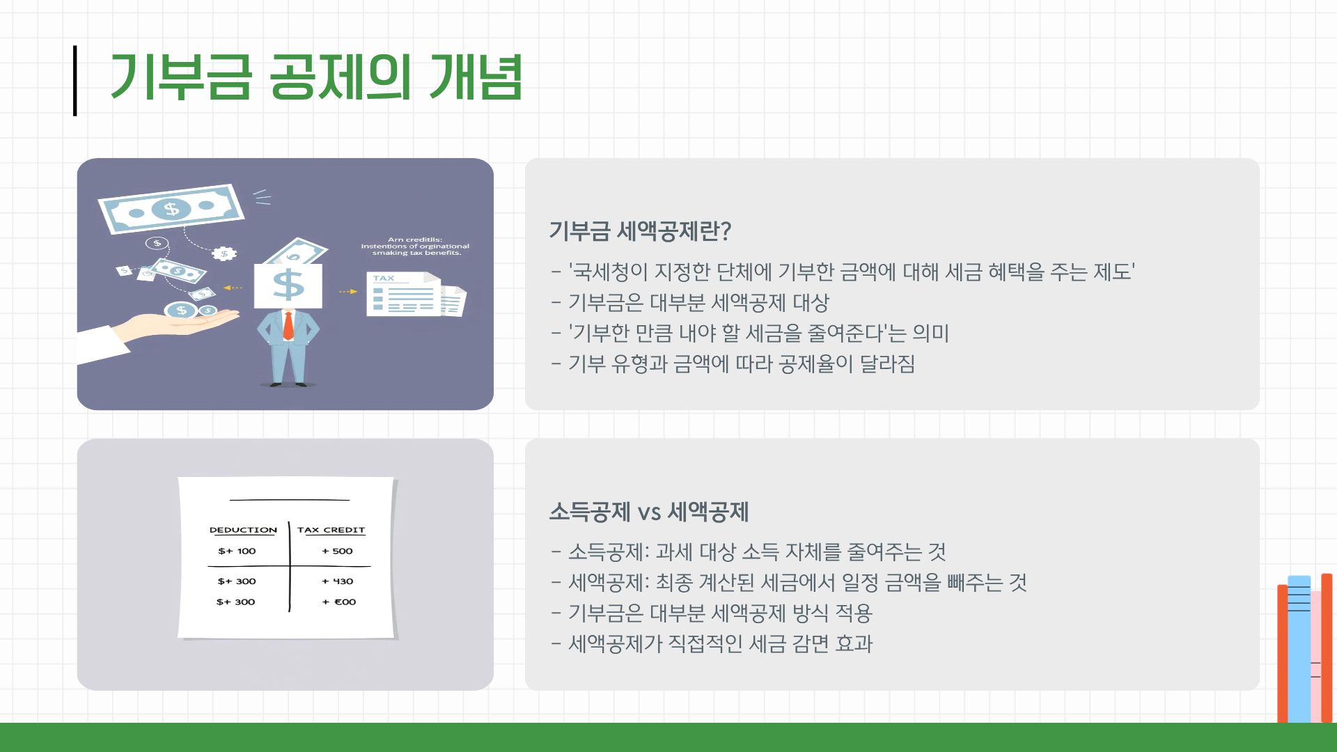 • 기부금은 세금 감면 + 사회 기여를 동시에 할 수 있는 항목