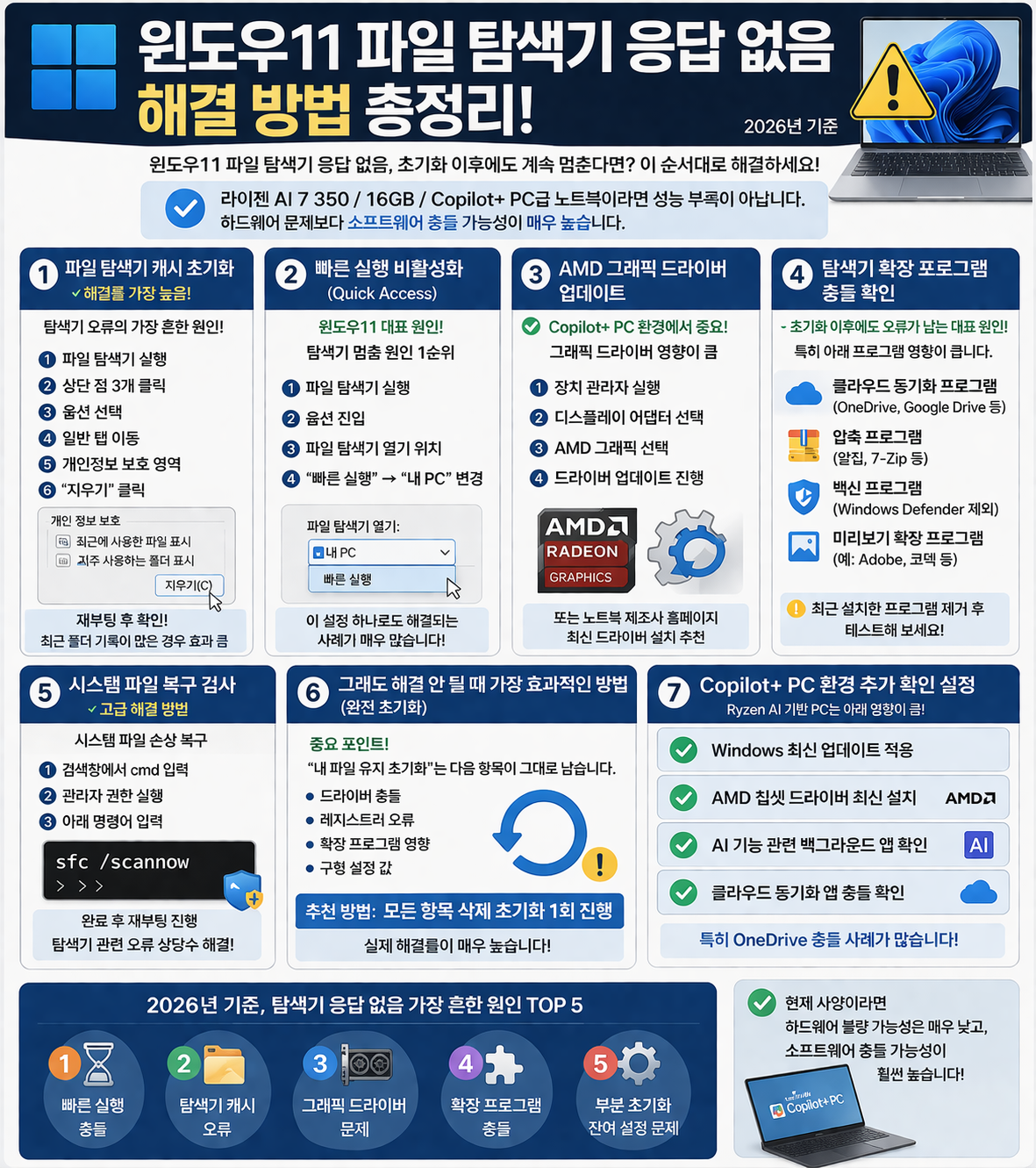 PC를 사용하다가 갑자기 화면이 멈추거나 윈도우11 파일 탐색기 응답 없음 메시지가 뜨면 무척 당혹스럽습니다. 특히 최신 사양인 Copilot+ PC나 Ryzen AI 7 350 프로세서를 탑재한 고성능 노트북에서도 이러한 윈도우11 파일 탐색기 응답 없음 현상이 발생하곤 하는데요.