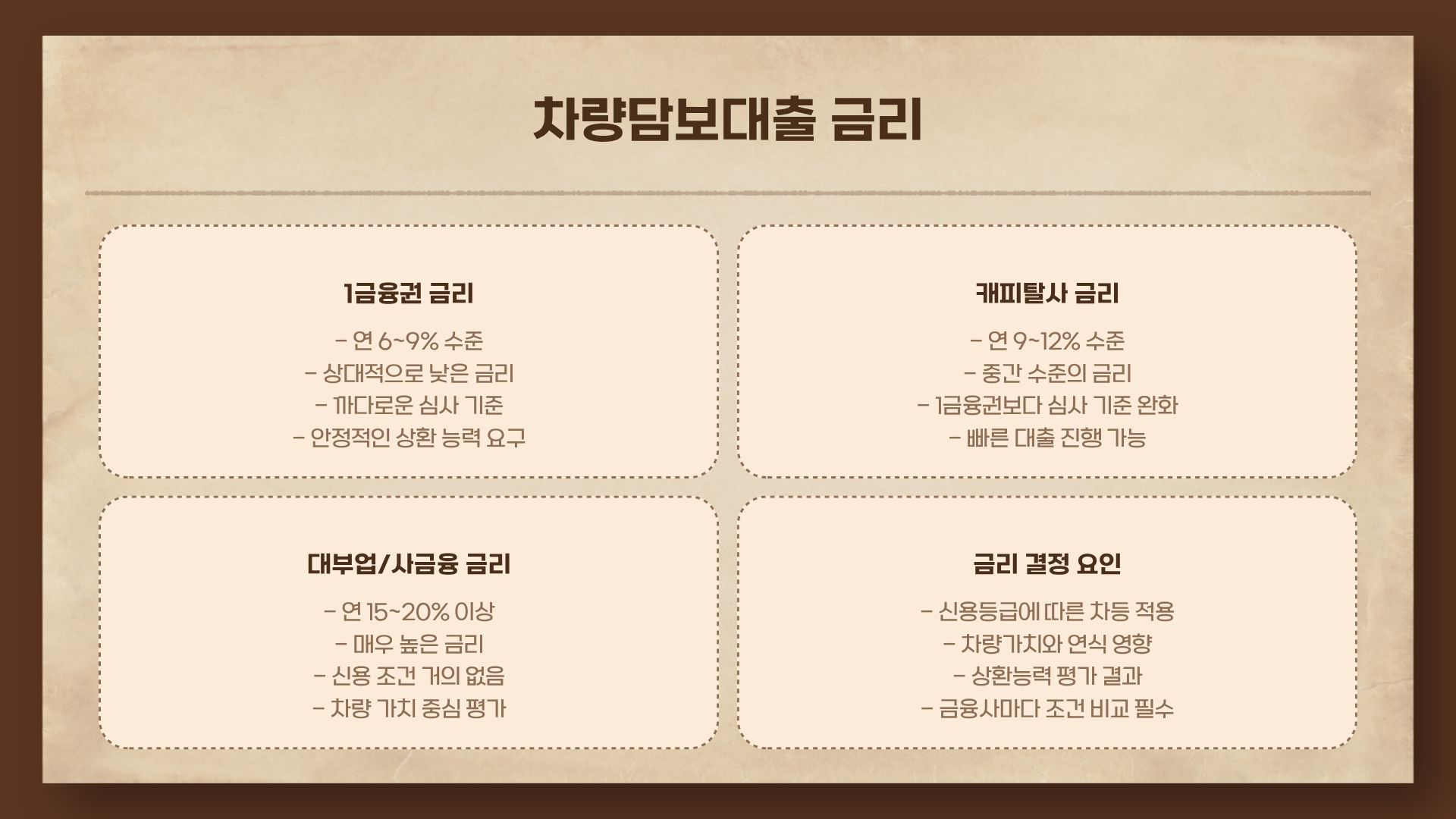 👉 차량담보대출 금리는 신용등급, 차량가치, 상환능력에 따라 달라지며, 동일 조건이라도 금융사마다 차이가 큽니다.