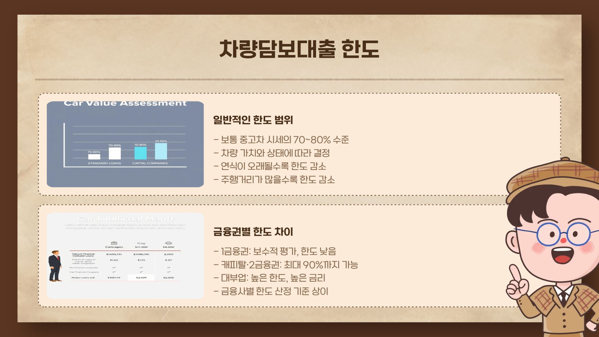 차량 연식이 10년 이내, 주행거리가 20만km 이하일수록 조건이 유리하며, 고가의 차량일수록 대출 한도도 높아집니다.