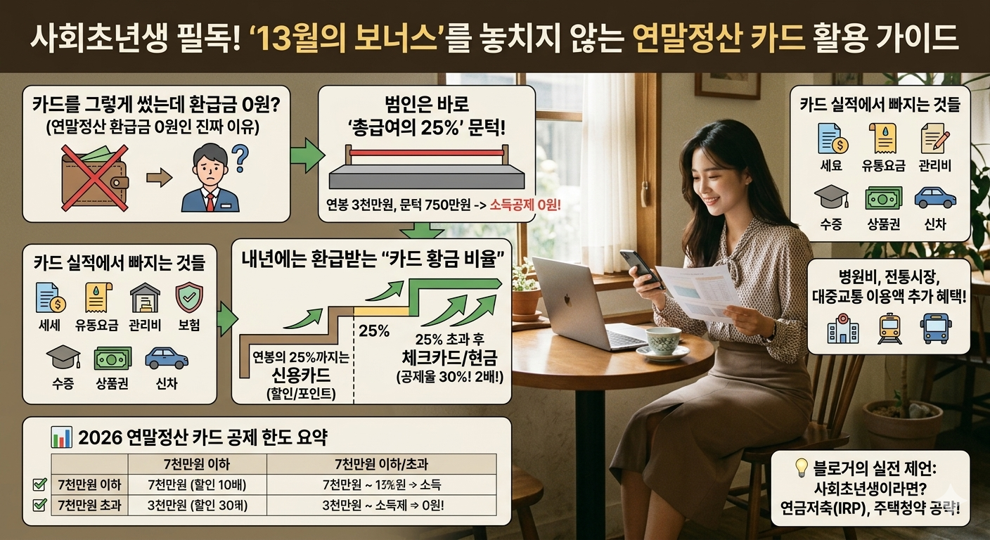 "연말정산 환급금이 0원? 13월의 보너스를 놓친 사회초년생이라면 반드시 알아야 할 '신용카드 25% 문턱'의 비밀! 연봉별 카드 소비 가이드와 신용·체크카드 황금 비율 전략을 블로거가 꼼꼼하게 정리했습니다. 내년에는 꼭 환급받으세요!"