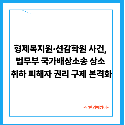 2025년 9월 14일, 법무부는 부산 형제복지원 사건과 경기도 선감학원 사건 피해자들이 제기한 국가배상 소송과 관련해 진행 중이던 상소(항소 및 상고)를 전면 취하 또는 포기했다고 공식 발표했습니다. 이번 조치는 국가가 스스로 책임을 인정하고 피해자들의 권리를 신속히 구제하겠다는 의지를 보여주는 중대한 결정으로 평가받고 있습니다.