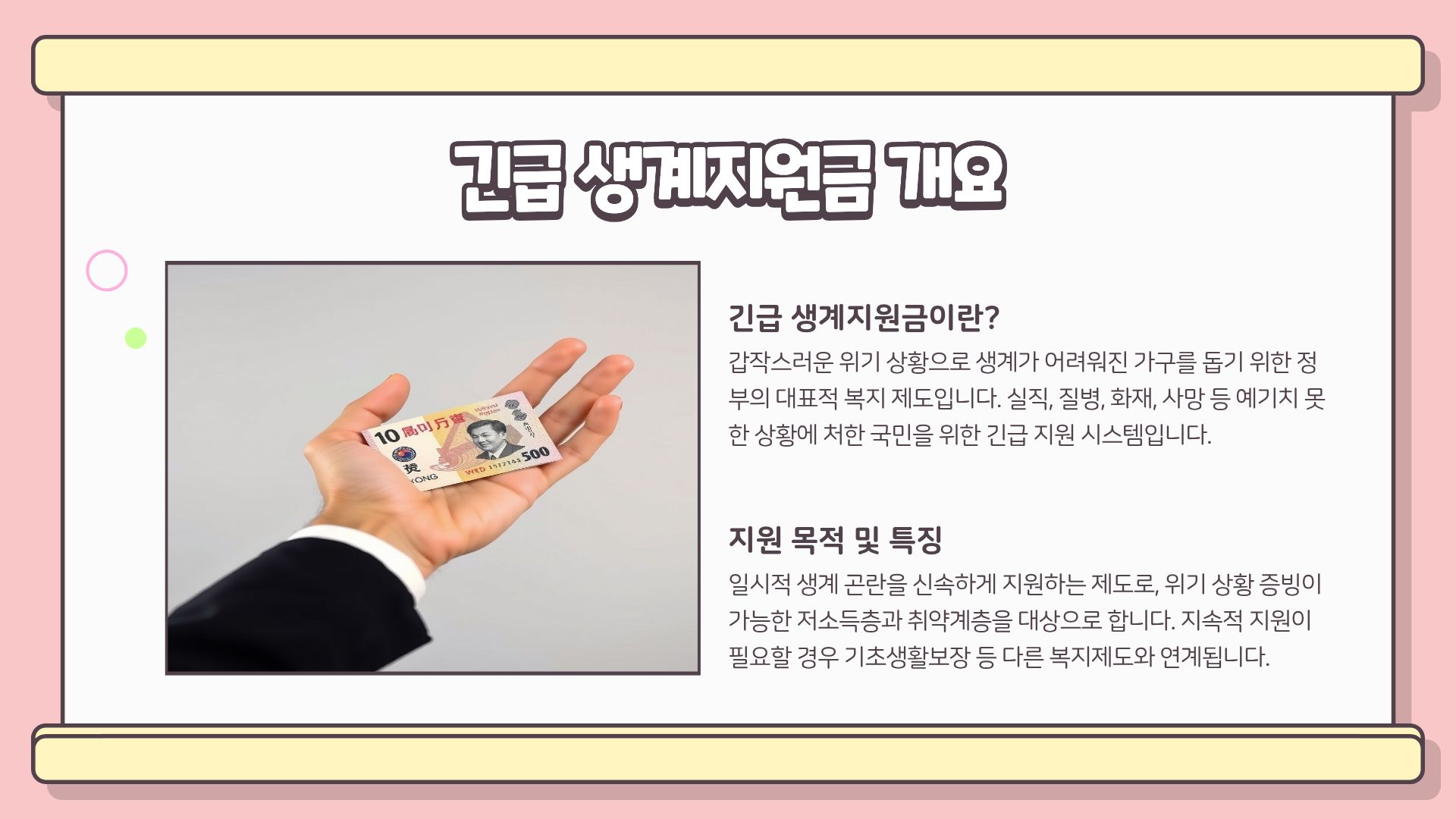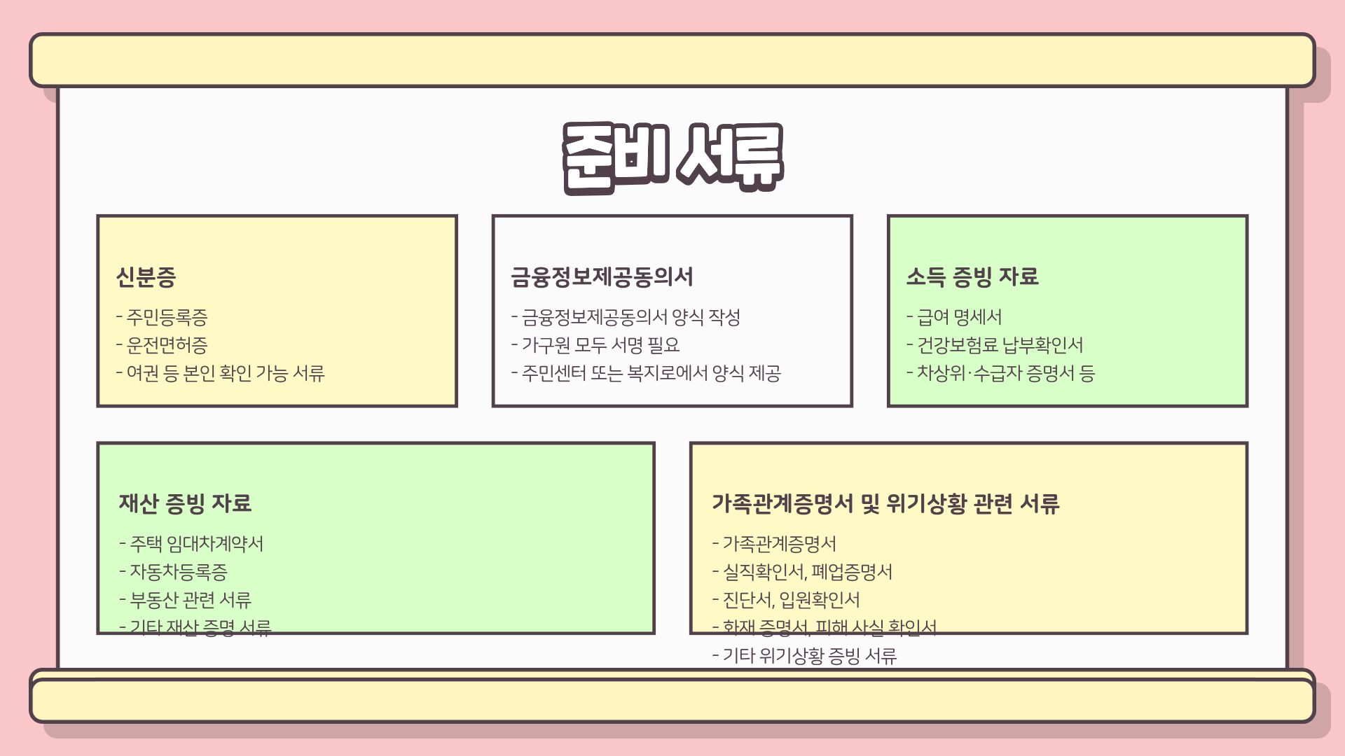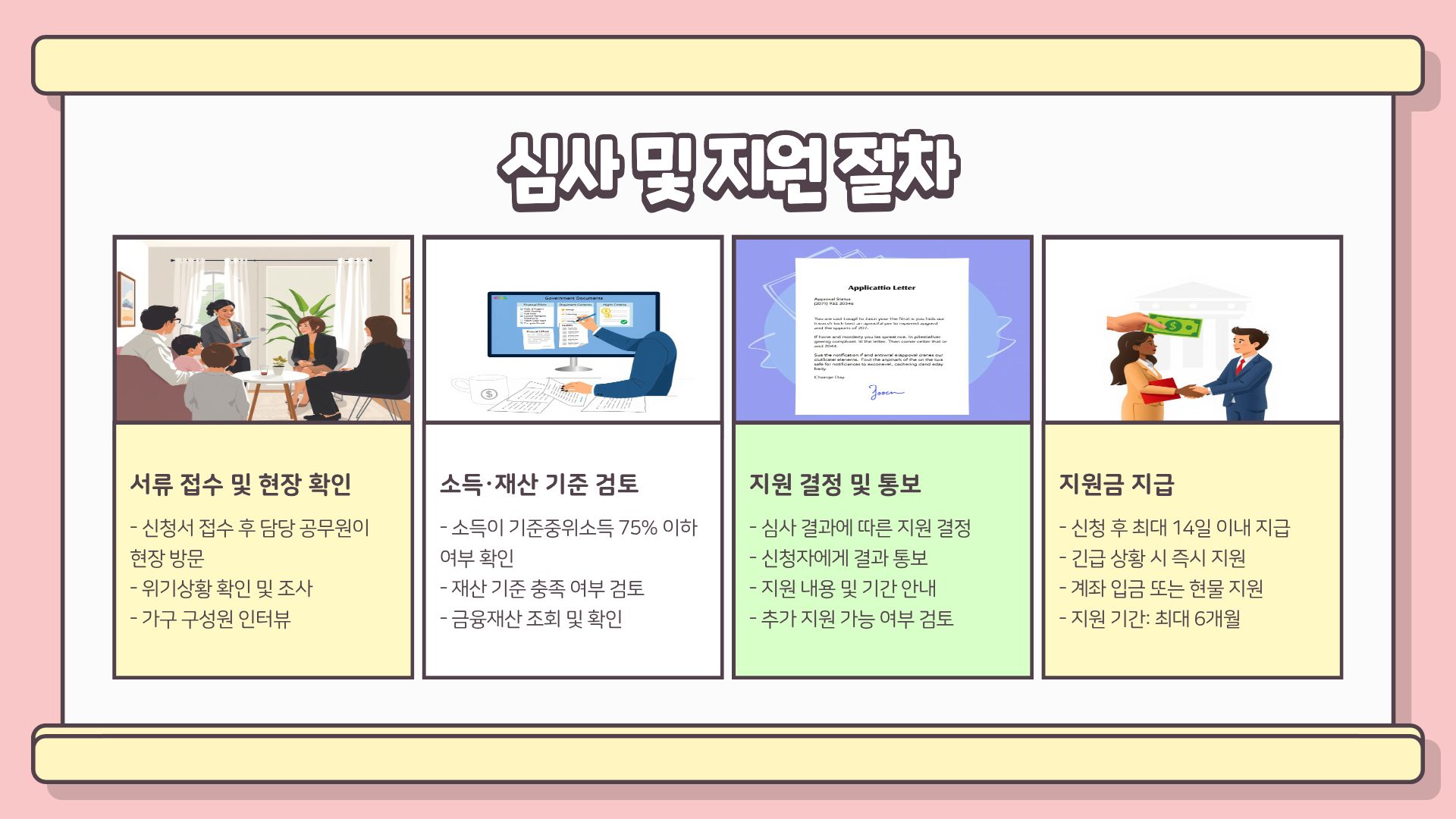 아래에서 긴급 생계지원금의 신청 자격, 서류, 신청 방법, 지원 절차를 단계별로 정리했습니다.