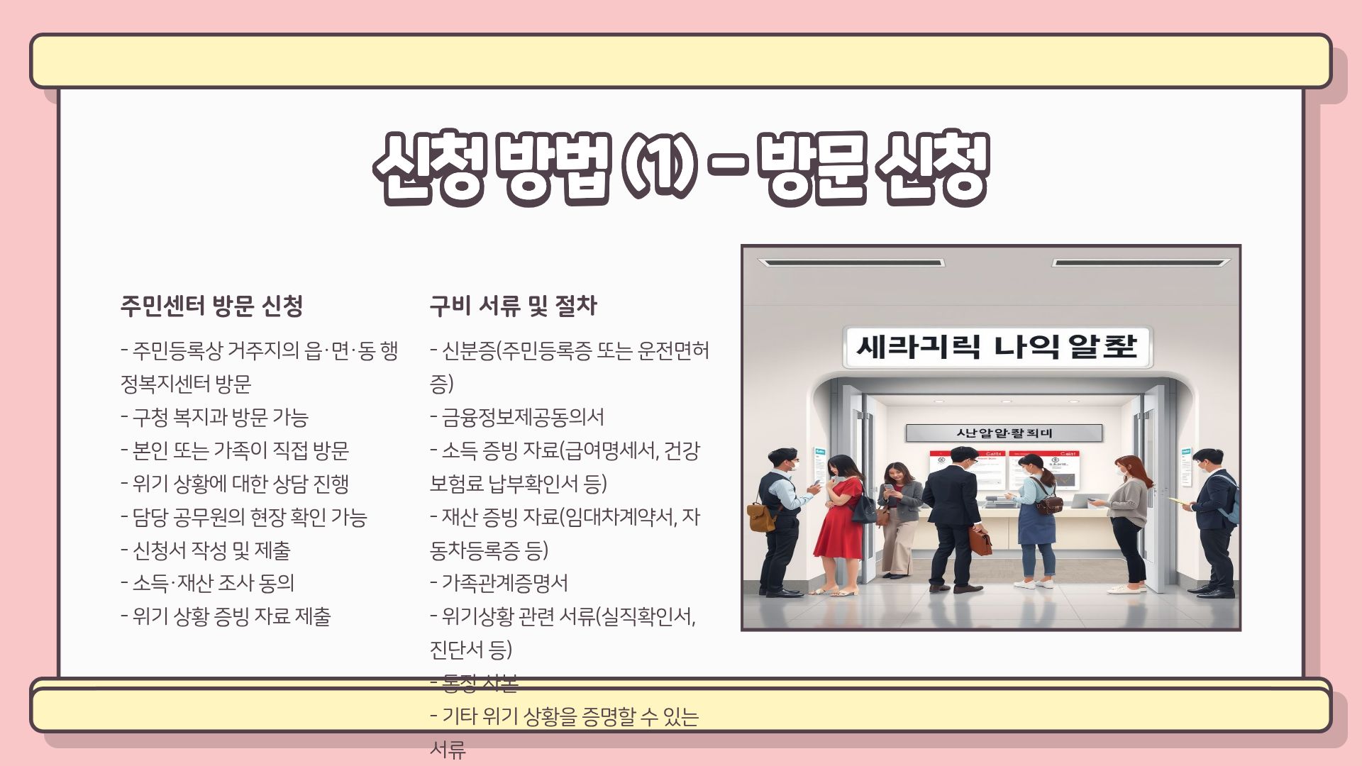 - 주민등록상 거주지의 읍·면·동 행정복지센터(주민센터) 또는 구청 복지과 방문