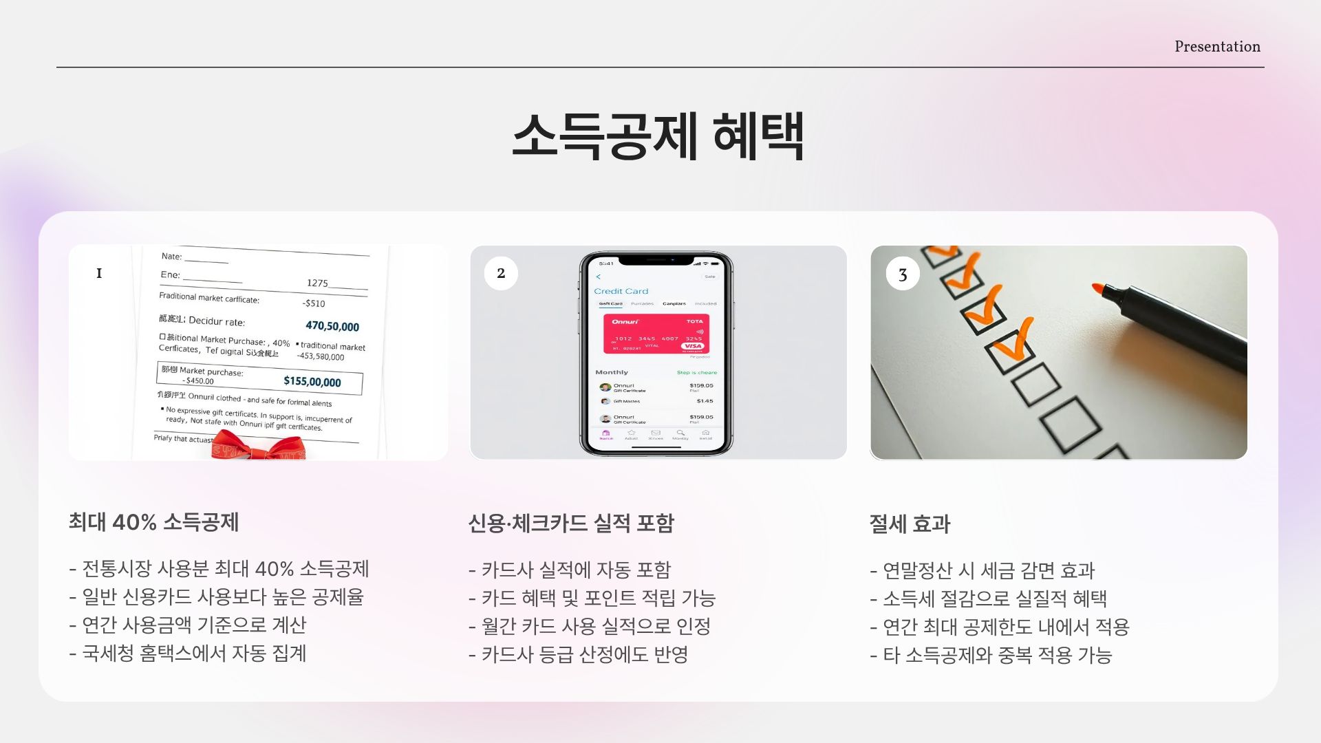 • 전통시장 사용분은 최대 40%까지 소득공제