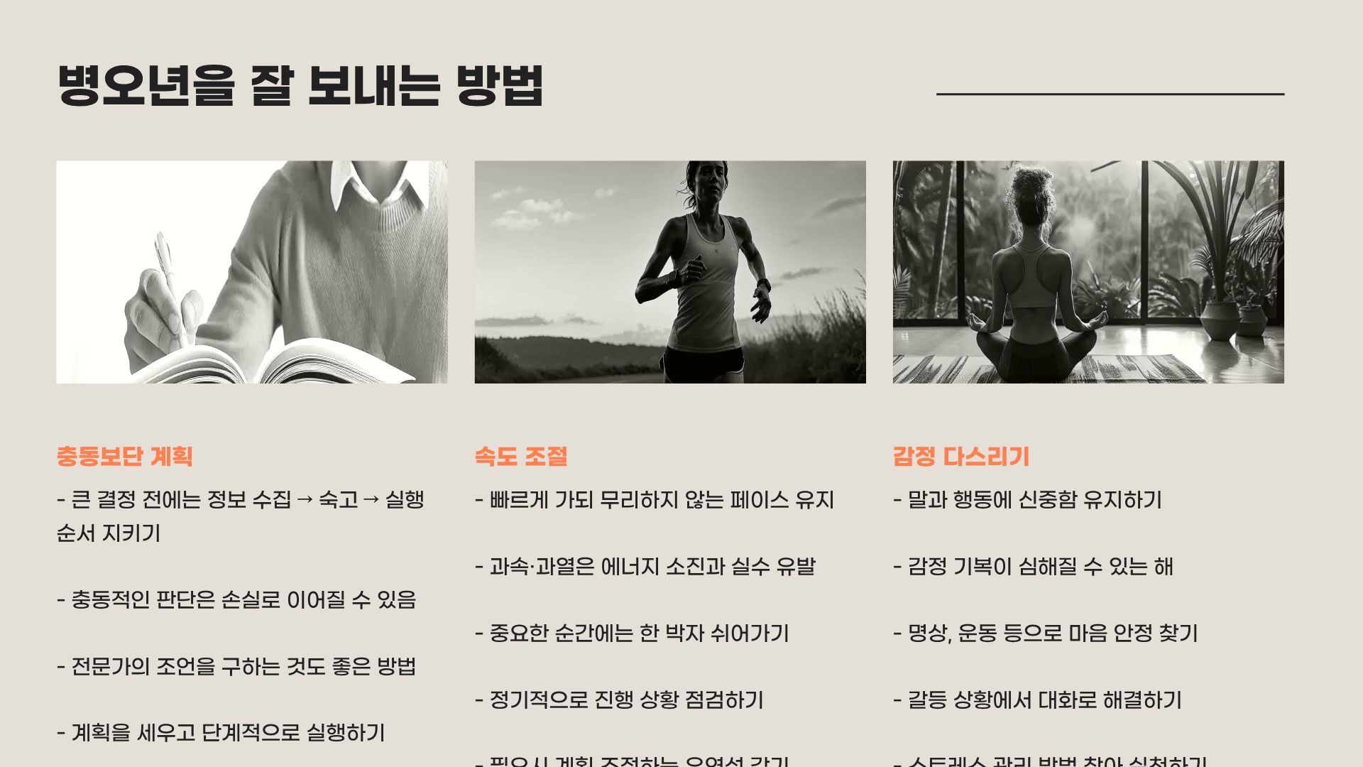 - 충동보단 계획: 큰 결정 전에는 정보 수집 → 숙고 → 실행