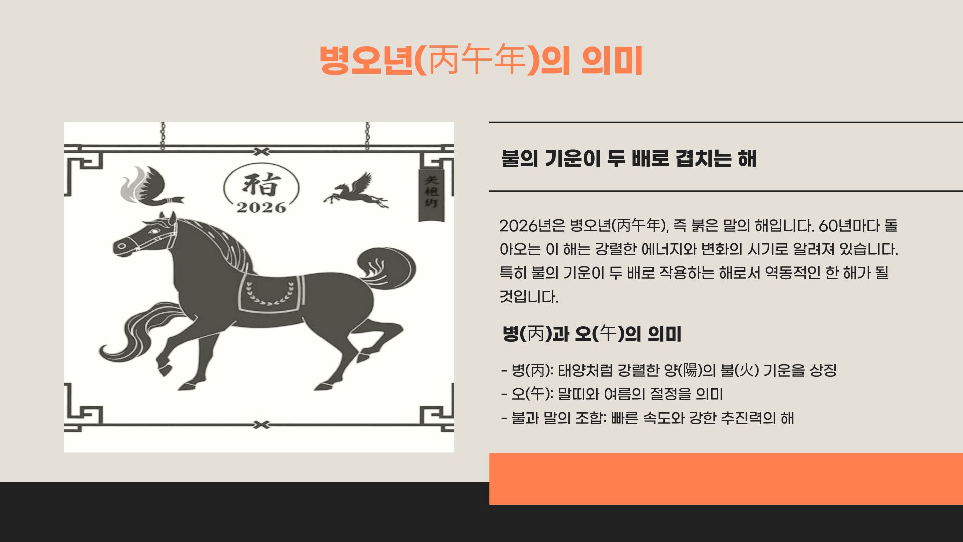 2026년은 병오년(丙午年), 즉 붉은 말의 해입니다. 병(丙)은 태양처럼 강렬한 양(陽)의 불(火) 기운을, 오(午)는 말띠와 여름의 절정을 뜻해 불의 기운이 두 배로 겹치는 해입니다. 이처럼 에너지, 변화, 속도가 강하게 작용하는 한 해가 될 것으로 보입니다.