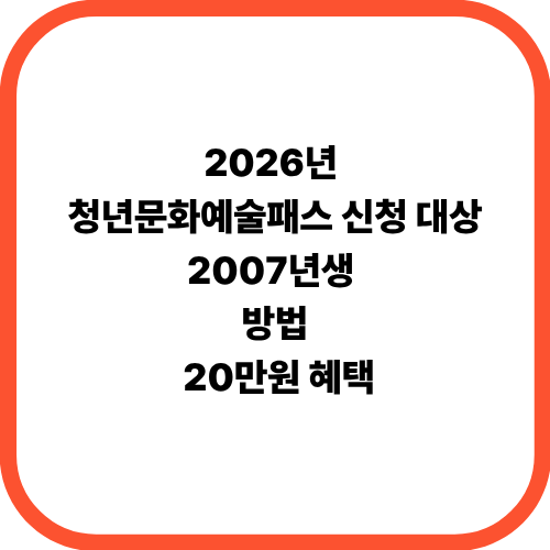 2026년에 드디어 성인이 되는 2007년생분들 축하드립니다! 오늘은 2007년생이라면 절대 놓쳐선 안 될 2026년 청년문화예술패스 신청 정보를 총정리해 드립니다. 많은 분이 2026년 청년문화예술패스 대상 연령에 대해 헷갈려하시는데요. 올해 2026년 청년문화예술패스 지원 대상은 누구인지, 얼마를 받을 수 있는지 확실하게 알려드리겠습니다. 지금 바로 2026년 청년문화예술패스 혜택을 확인해 보세요.