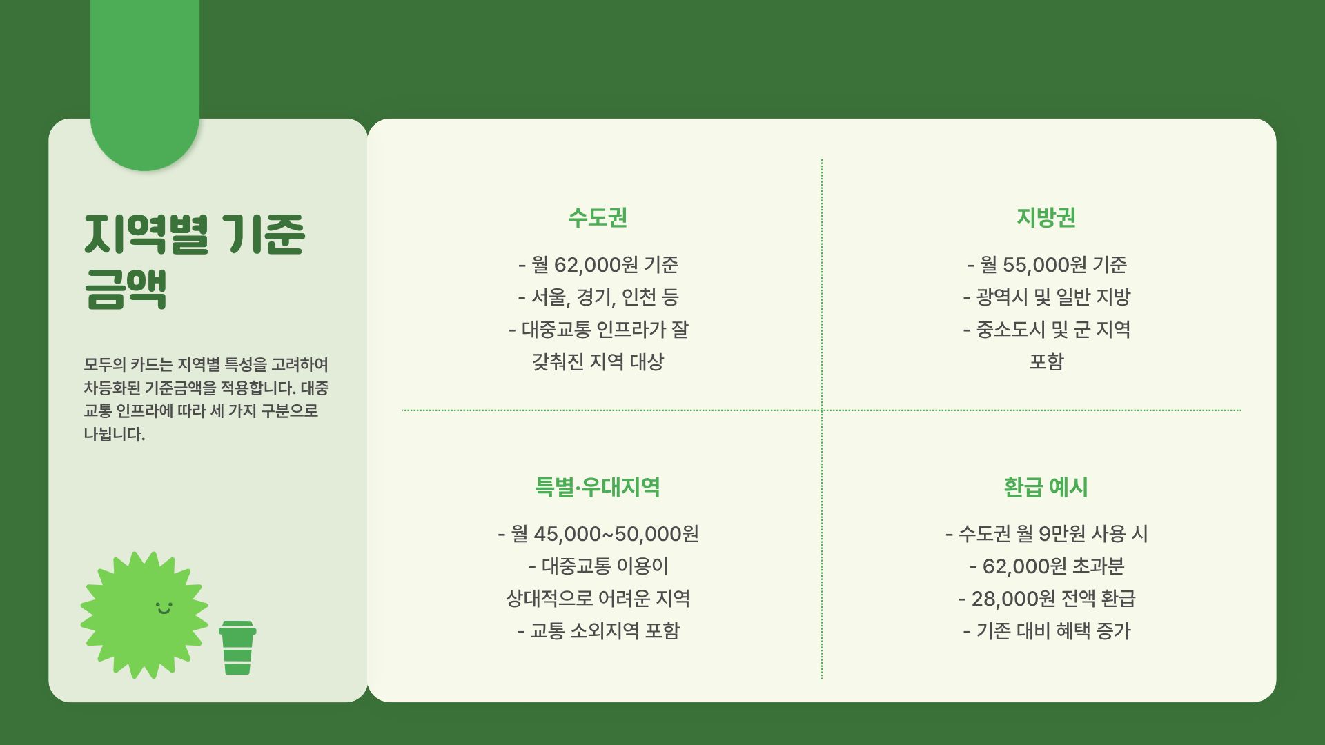 기존에는 대중교통 사용액의 20~30%를 일부 환급받는 구조였다면, 이제는 월 기준금액을 초과한 금액을 전액 환급해주는 구조로 바뀌었습니다.