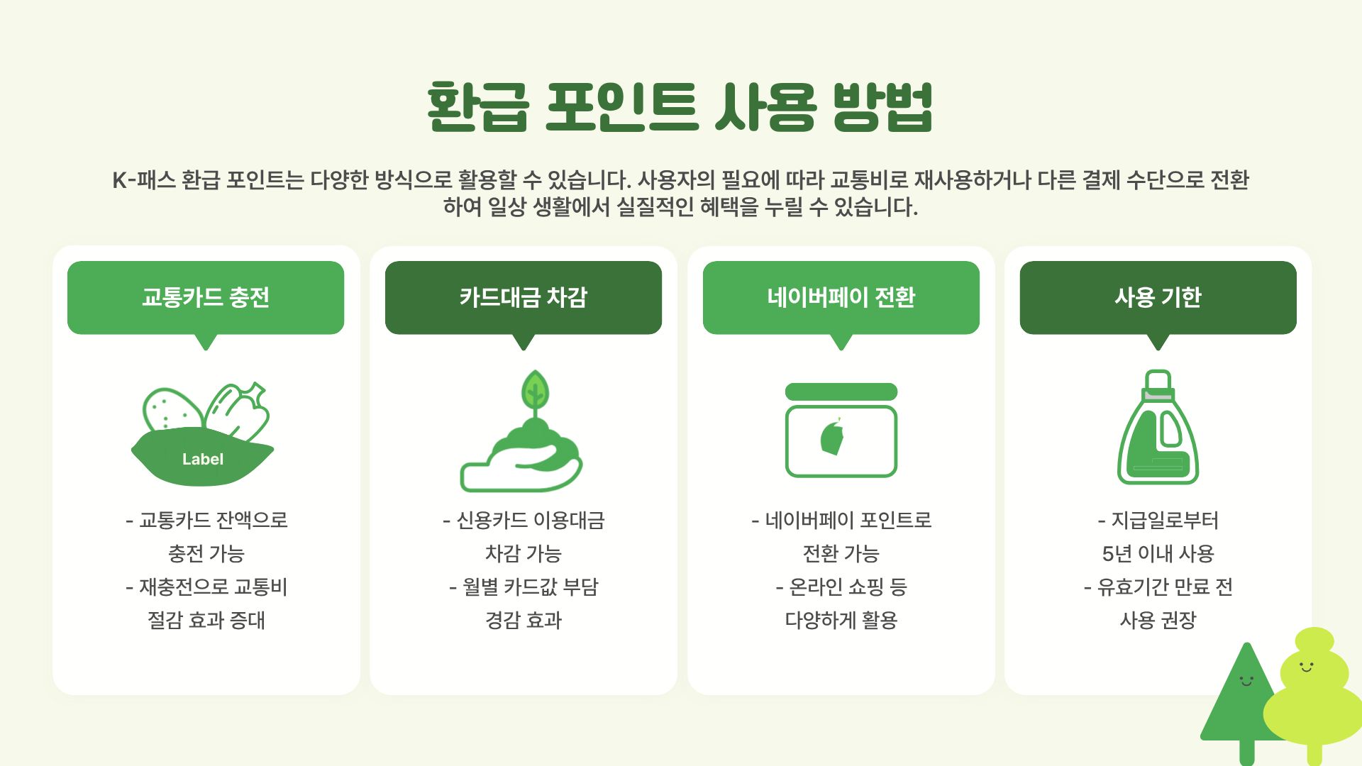 - 환급 포인트는 교통카드 충전, 카드대금 차감, 네이버페이 전환 등으로 사용 가능