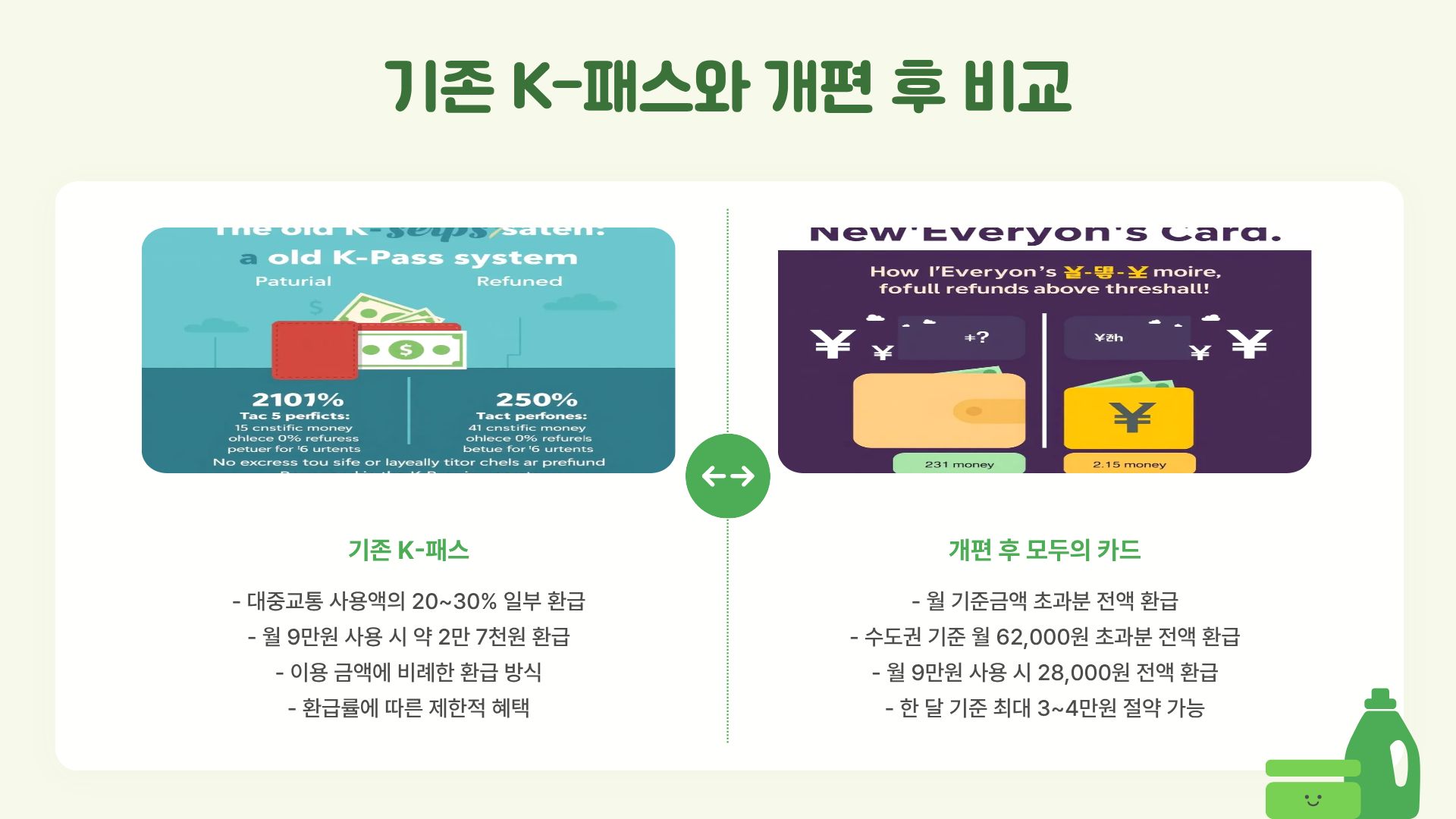- 기존 K패스: 월 9만 원 사용 → 약 2만 7천 원 환급